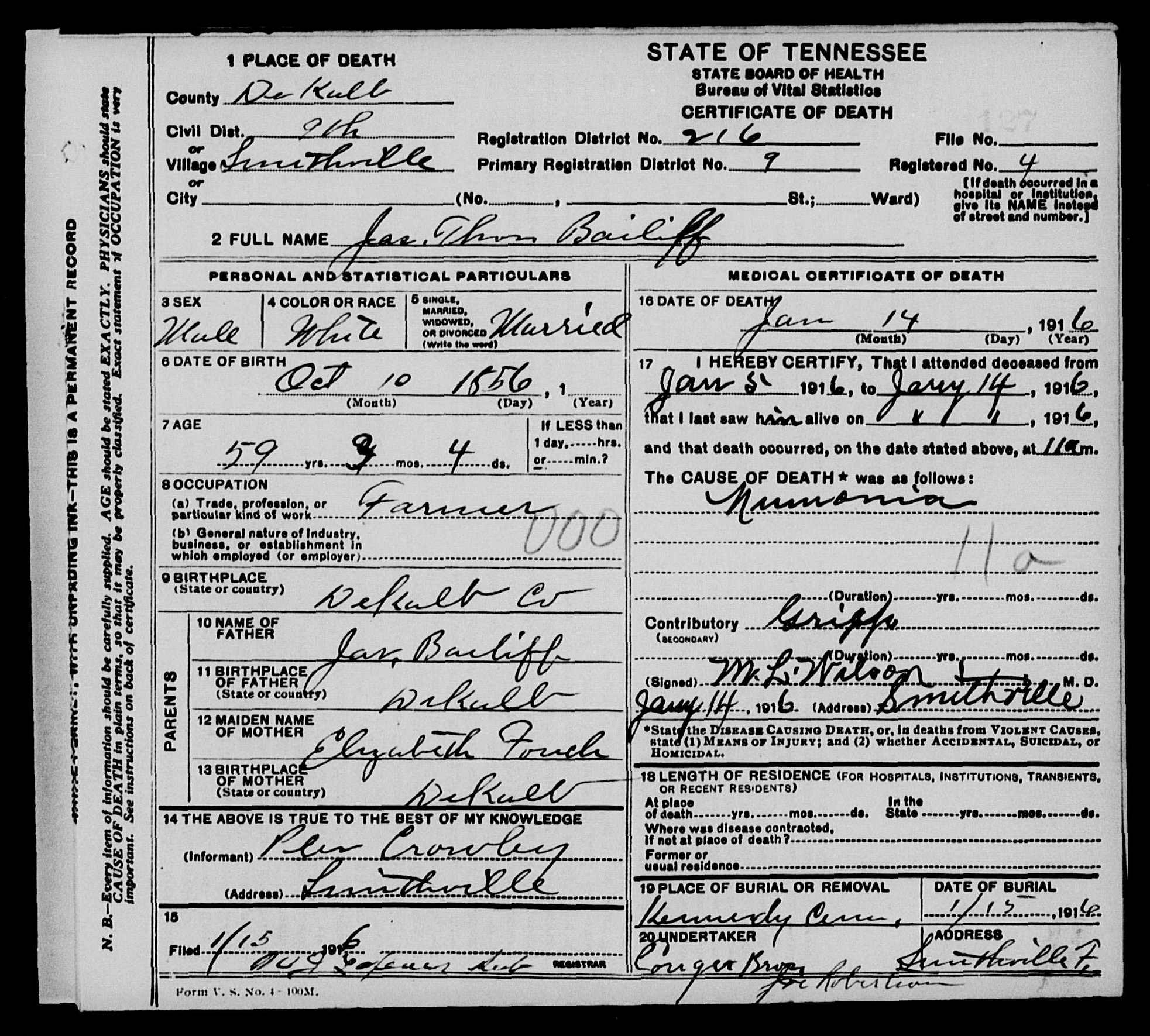 Death Certificate of James Thomas Bailiff