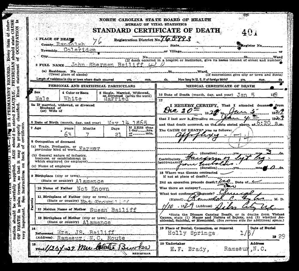 Death Certificate of John Sherman Bailiff