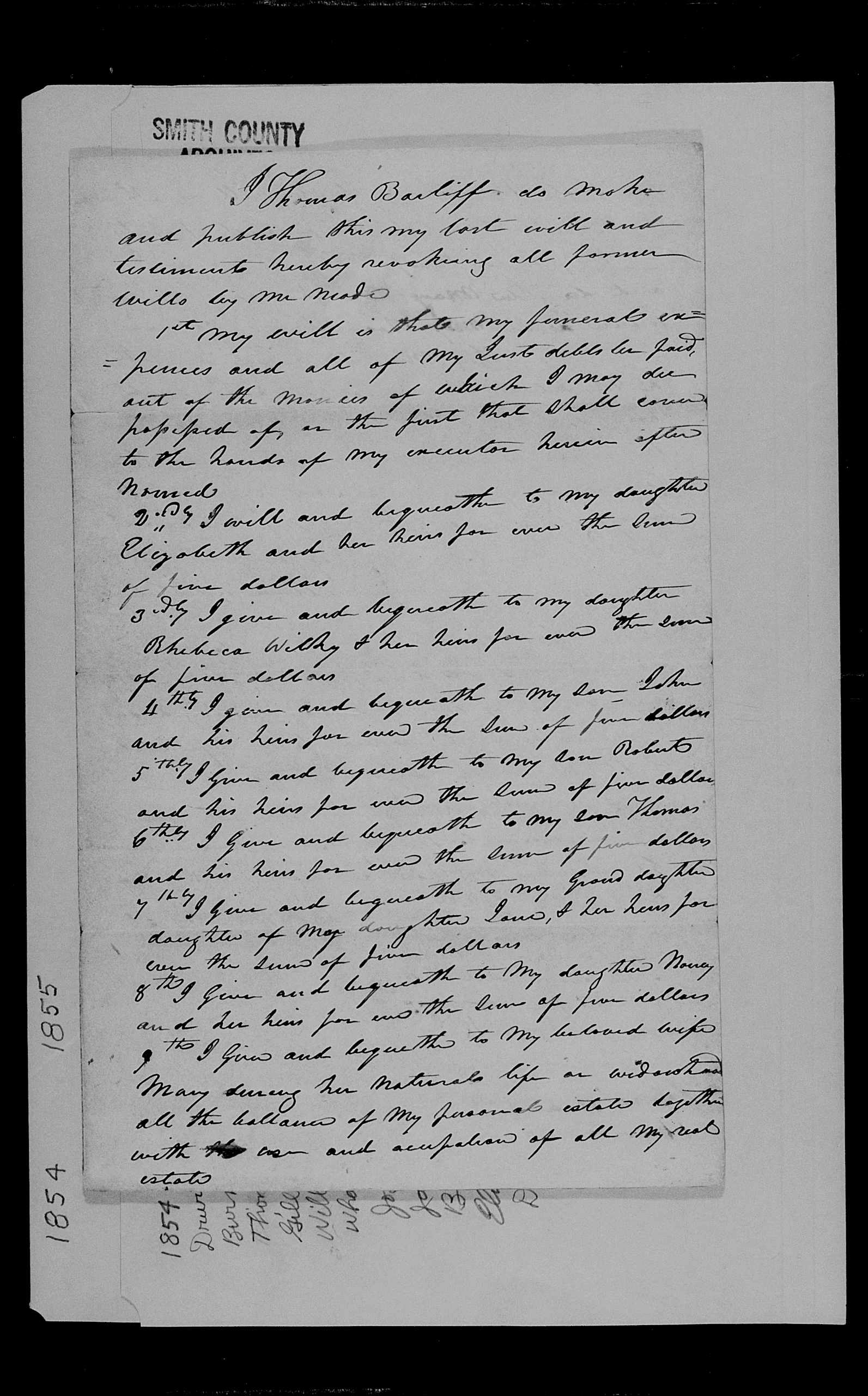 Will of Thomas Bailiff (handwritten, page 1 of 3)