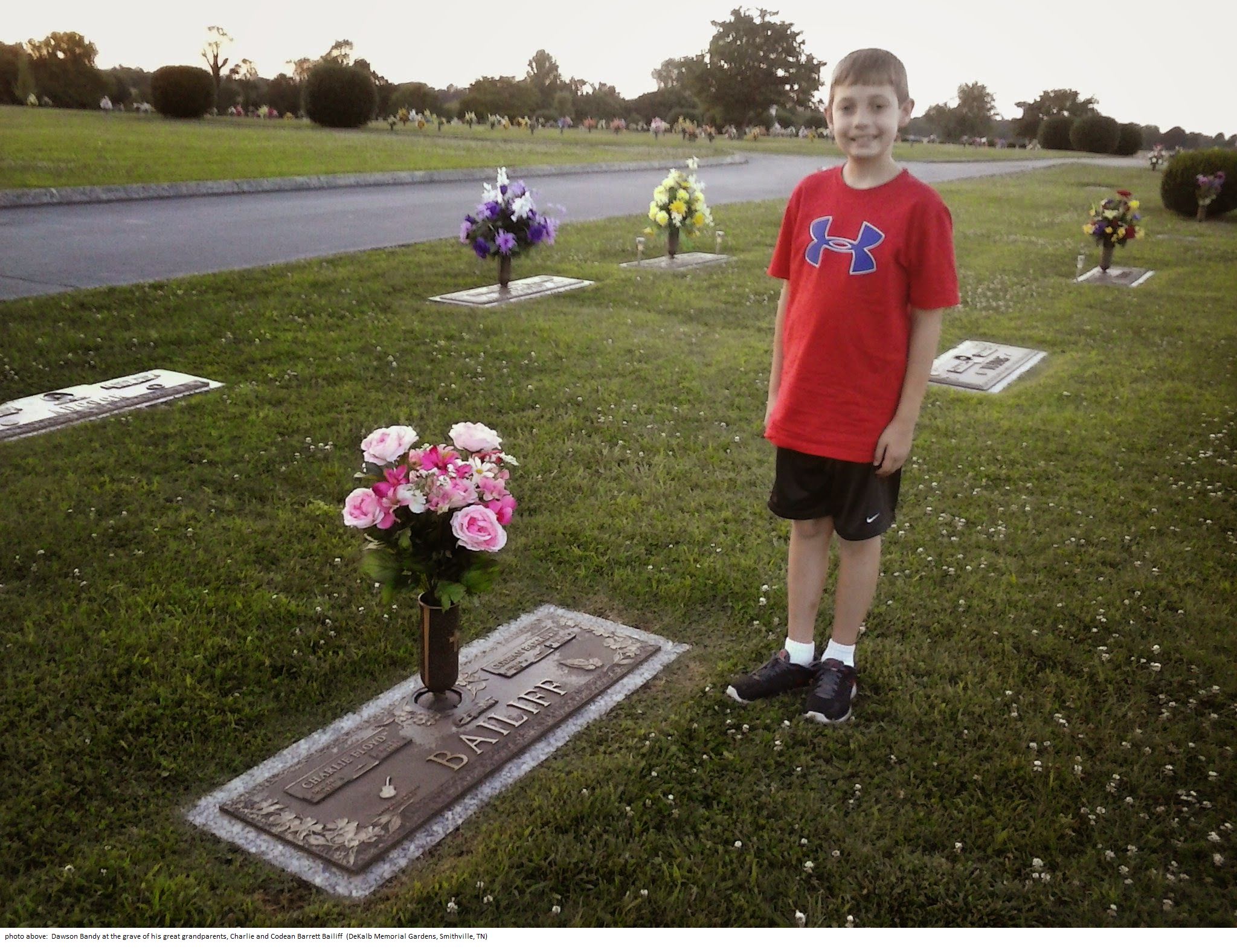 Dawson Bandy at grave of his great grandparents, Charlie and Codean Barrett Bailiff (DeKalb Memorial Gardens, DeKalb Co, TN)