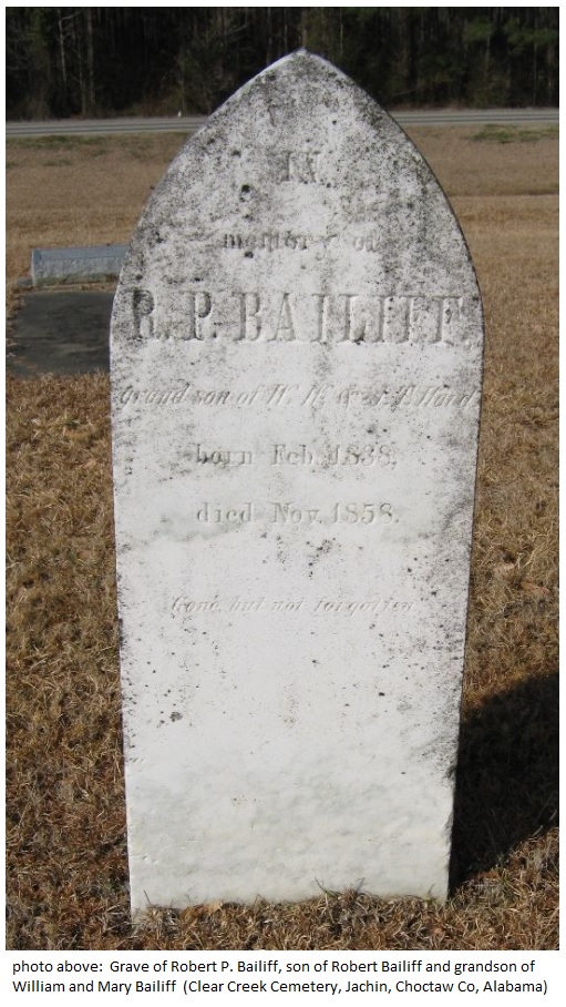 Headstone of Robert P. Bailiff, son of Robert Bailiff and grandson of William and Mary Bailiff (Clear Creek Cemetery, Jachin, Choctaw Co, Alabama)
