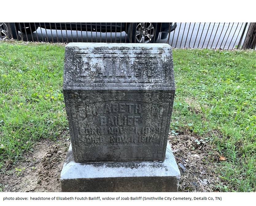 headstone of Elizabeth Foutch Bailiff, widow of Joab Bailiff (Smithville City Cemetery, DeKalb Co, TN)