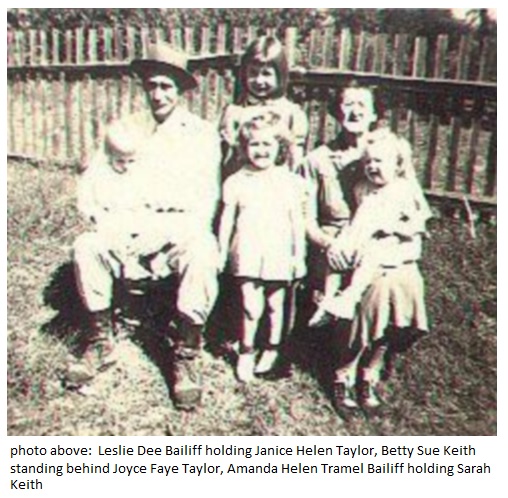 Leslie Dee Bailiff holding Janice Helen Taylor, Betty Sue Keith standing behind Joyce Faye Taylor, and Amanda Tramel Bailiff holding Sarah Keith
