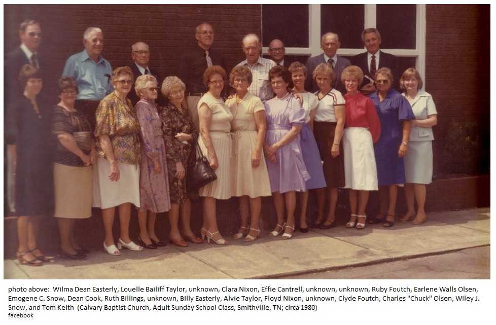 Wilma Dean Easterly, Louelle Bailiff Taylor, Clara Nixon, Effie Cantrell, Ruby Foutch, Earlene Walls Olsen, Emogene Snow, Dean Cook, Ruth Billings, Billy Easterly, Alvie Taylor, Floyd Nixon, Clyde Foutch, Charles "Chuck" Olsen, Wiley J. Snow, and Tom Keith (Calvary Baptist Church)