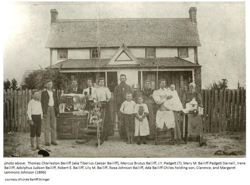 Thomas Charleston Bailiff (aka Tiberius Caesar Bailiff), Marcus Brutus Bailiff, J.Y. Padgett, Mary M. Bailiff Padgett Darnell, Irene Bailiff, Adolphus Judson Bailiff, Robert E. Bailiff, Lily M. Bailiff, Rosa Johnson Bailiff, Ada Bailiff Chiles holding son, Clarence, and Margaret Lemmons Johnson (1896)