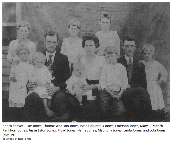 Elsie Jones, Thomas Addison Jones, Isiah Columbus Jones, Emerson Jones, Mary Elizabeth Rankhorn Jones, Jesse Eston Jones, Floyd Jones, Hallie Jones, Magnolia Jones, Leola Jones, and Lola Jones