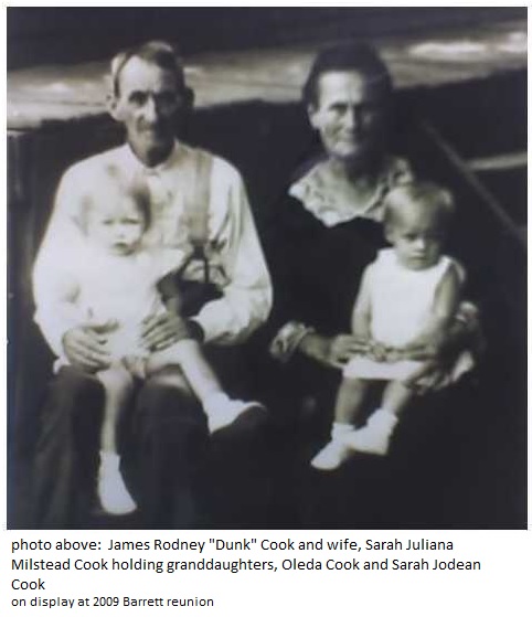 James Rodney "Dunk" Cook and wife, Sarah Juliana Milstead Cook holding granddaughters, Oleda Cook and Sarah Jodean Cook