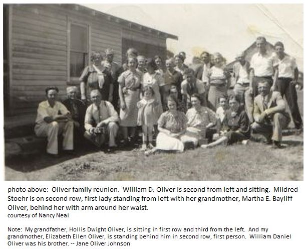 Oliver family reunion picturing William Daniel Oliver, Mildred Stoehr, Martha E. Bayliff Oliver, Hollis Dwight Oliver, and Elizabeth Ellen Oliver.
