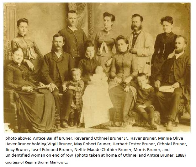Antice Bailiff Bruner, Reverend Othniel Bruner Jr., Haver Bruner, Minnie Olive Haver Bruner holding Virgil Bruner, May Robert Bruner, Herbert Foster Bruner, Othniel Bruner, Jincy Bruner, Josef Edmund Bruner, Nellie Maude Clothier Bruner, Morris Bruner, and unidentified woman on end of row