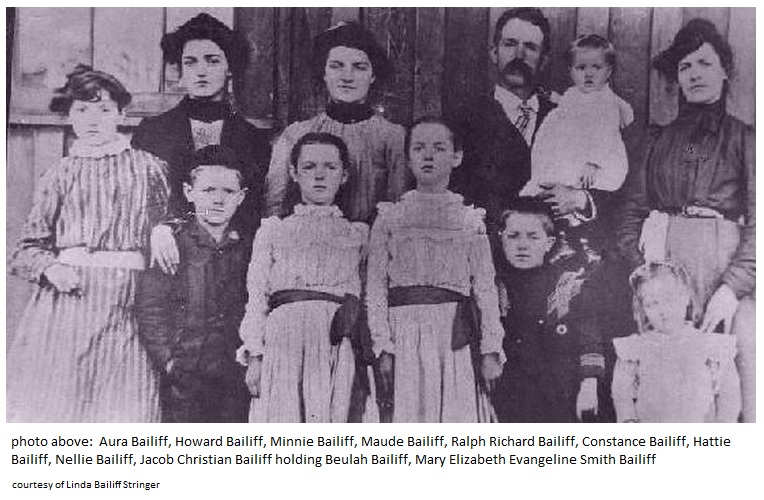 Aura Bailiff, Howard Bailiff, Minnie Bailiff, Maude Bailiff, Ralph Richard Bailiff, Constance Bailiff, Hattie Bailiff, Nellie Bailiff, Jacob Christian Bailiff holding Beulah Bailiff, and Mary Elizabeth Evangeline Smith Bailiff