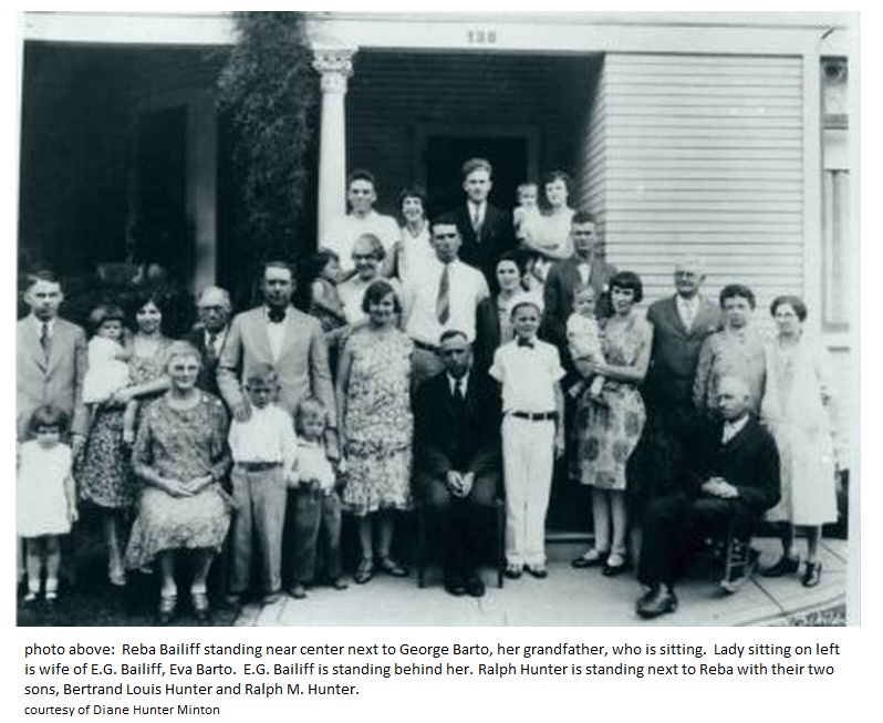 Reba Bailiff standing near center next to George Barto, her grandfather, who is sitting. Lady sitting on left is wife of E.G. Bailiff, Eva Barto. E.G. Bailiff is standing behind her. Ralph Hunter is standing next to Reba with their two sons, Bertrand Louis Hunter and Ralph M. Hunter.