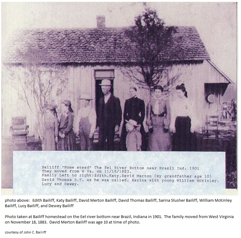 Edith Bailiff, Katy Bailiff, David Merton Bailiff, David Thomas Bailiff, Sarina Slusher Bailiff, William McKinley Bailiff, Lucy Bailiff, and Dewey Bailiff at Bailiff homestead in 1901 located on Eel river bottom near Brazil, Indiana.