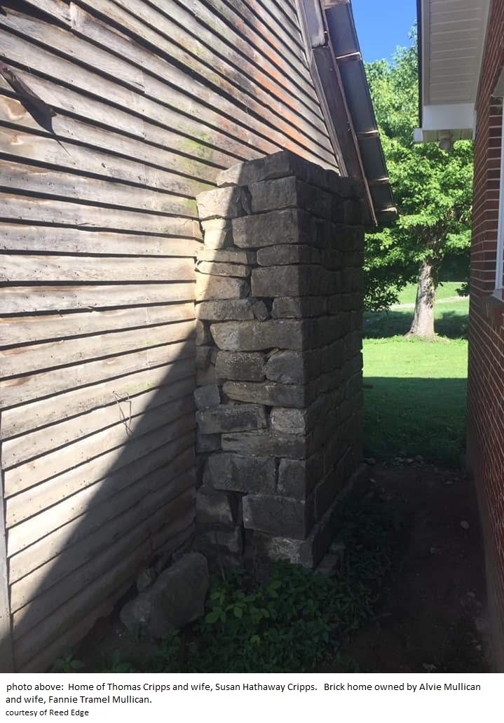 Home of Thomas Cripps and wife, Susan Hathaway Cripps. Brick home owned by Alvie Mullican and wife, Fannie Tramel Mullican.