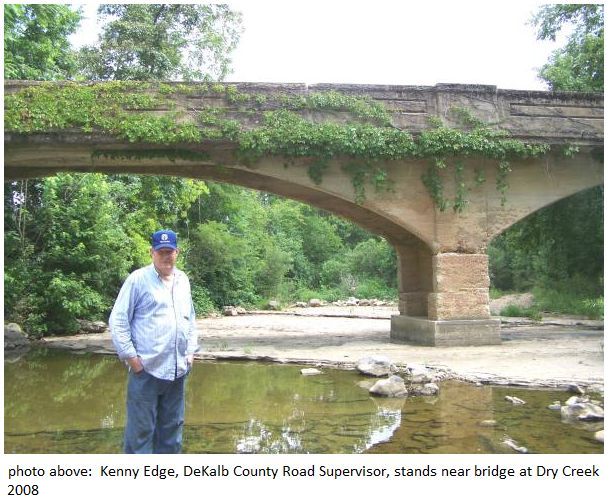 County Mayor Mike Foster says this concrete arch bridge is on Dry Creek Lane, a short road that connects Dry Creek Road and the Old Dry Creek Road, just off Highway 70. " There's very little traffic on it but it is kind of a unique bridge. We got a letter from the state concerning this bridge. They are basically saying that it either needs to be replaced or closed. You can get on either Old Dry Creek or New Dry Creek Road within a hundred yards on either side of the bridge. So it (Dry Creek Lane) just connects that little area there. It doesn't make sense to spend a half a million dollars putting a new bridge there when we need them in other places. It was Kenny's (Edge) recommendation that we close the bridge to traffic but blocking it so that it can be open to foot traffic and that it be retained as an Historical site because of it's unique construction."