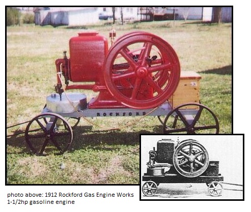 The color for this Rockford engine was red. The larger side-shafts were a wine color. While the 3hp hopper-cooled were dark green. I suspect that the reason for this engine being red is that it was sold after the buy out by Emerson-Brantingham. E-B's color is red.