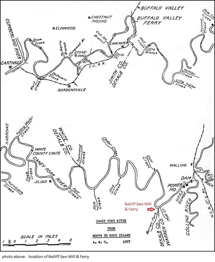 Bailiff Ferry - often referred as "Old Bailiff Ferry" - 4 miles below Great Falls in Horseshoe Bend, where Webb School Camp was located in the 1930's. At one time called Cotton Ferry.