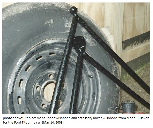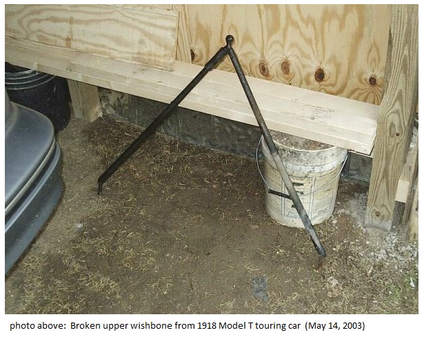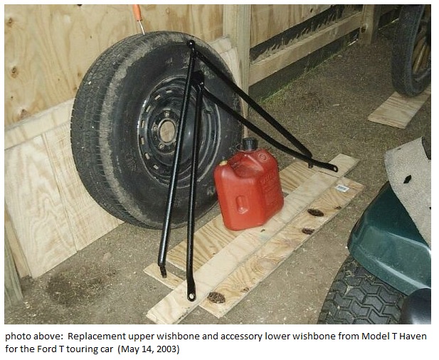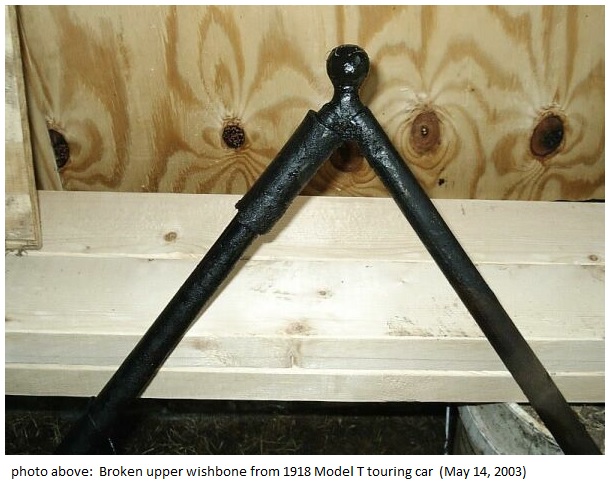 I ordered a replacement early style above axle wishbone along with an accessory below axle wishbone from Model T Haven. They arrived within a few days. I sanded them and painted them black. I included a few photos of the original wishbones that I removed. You can see the breaks in the photographs.