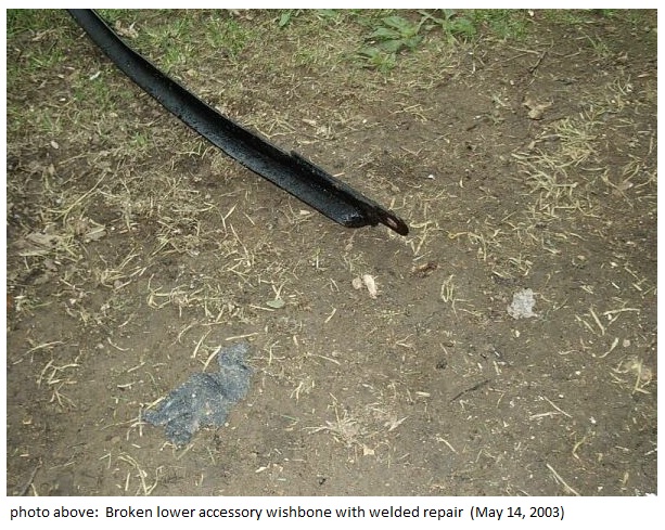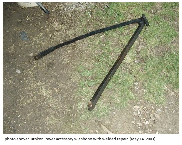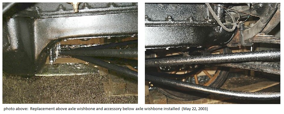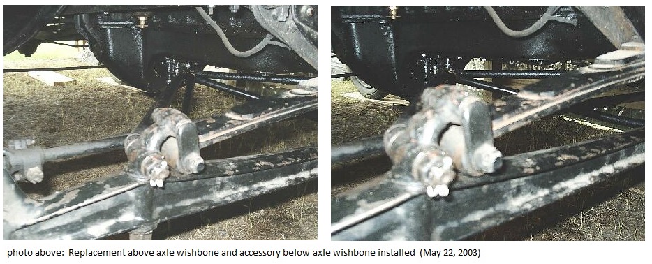 I replaced the above axle wishbone using new studs, springs, nuts, and safety wire from Smith & Jones for the ball cup. The below accessory wishbone had to be adjusted some to fit, but went into place nicely. It connected to the above axle wishbone with plates fitting both above and below the wishbone. Two bolts hold it in place.