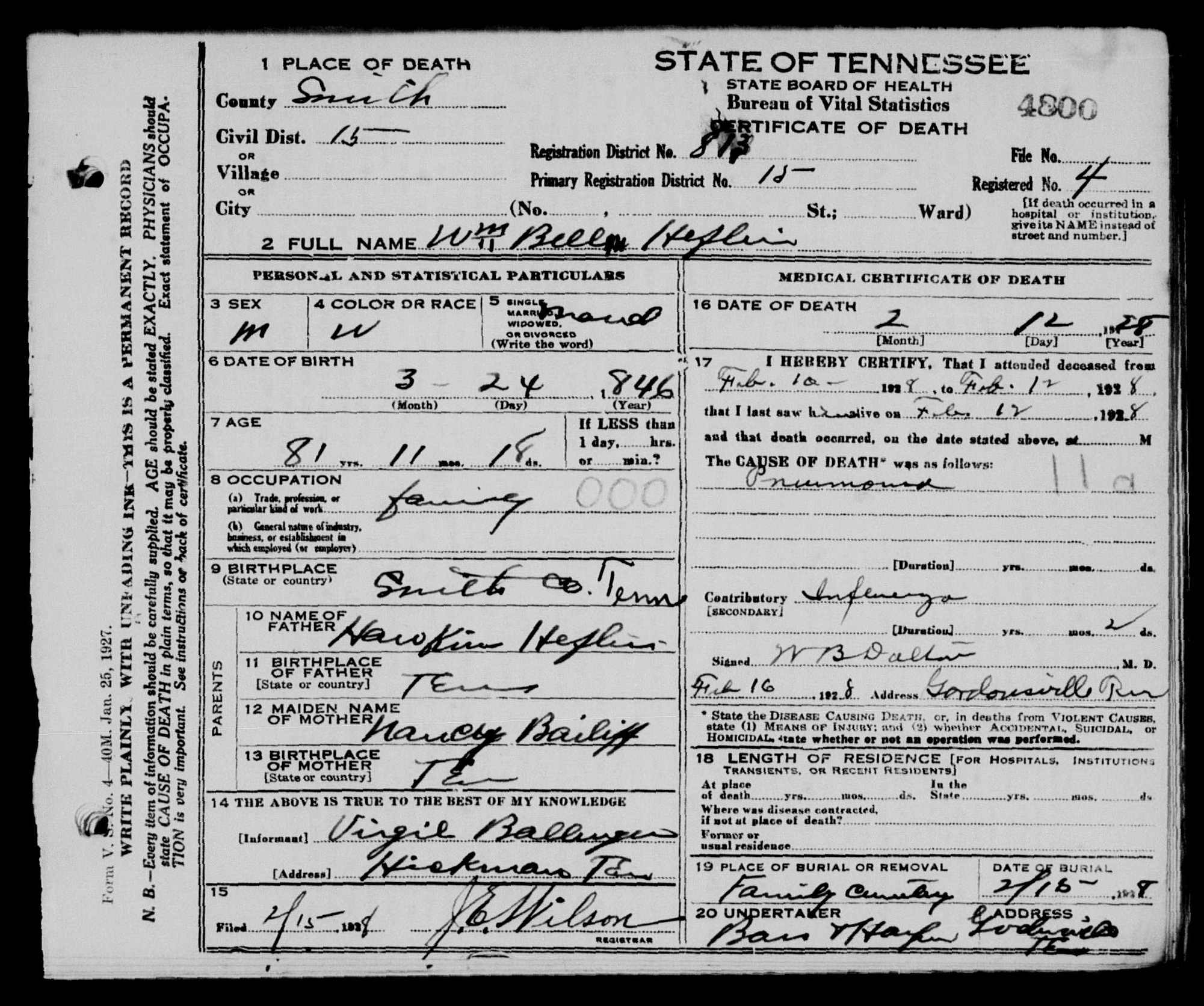 Death Certificate of William Heflin