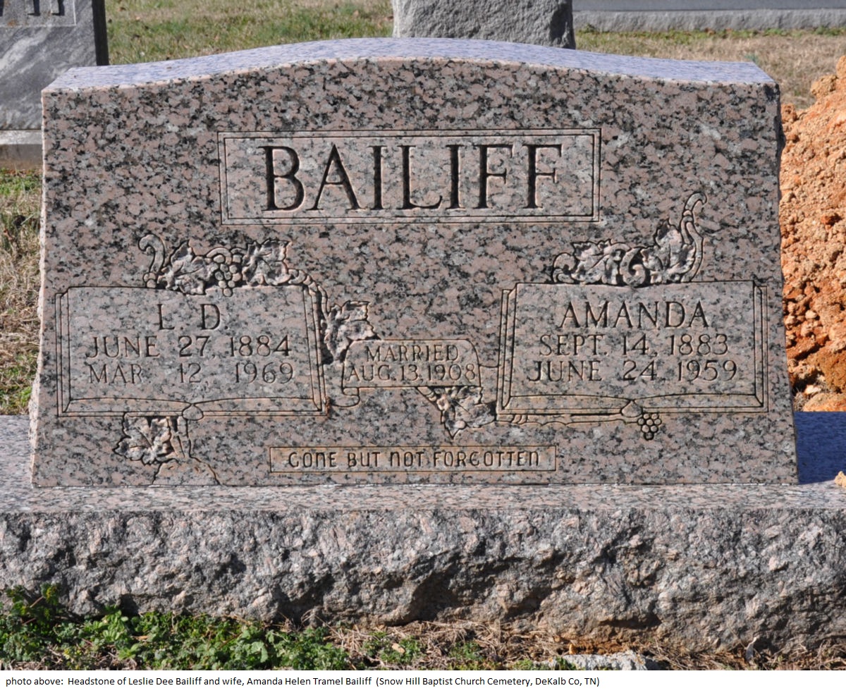 Headstone of Leslie Dee Bailiff and wife, Amanda Helen Tramel Bailiff (Snow Hill Baptist Church Cemetery, DeKalb Co, TN)