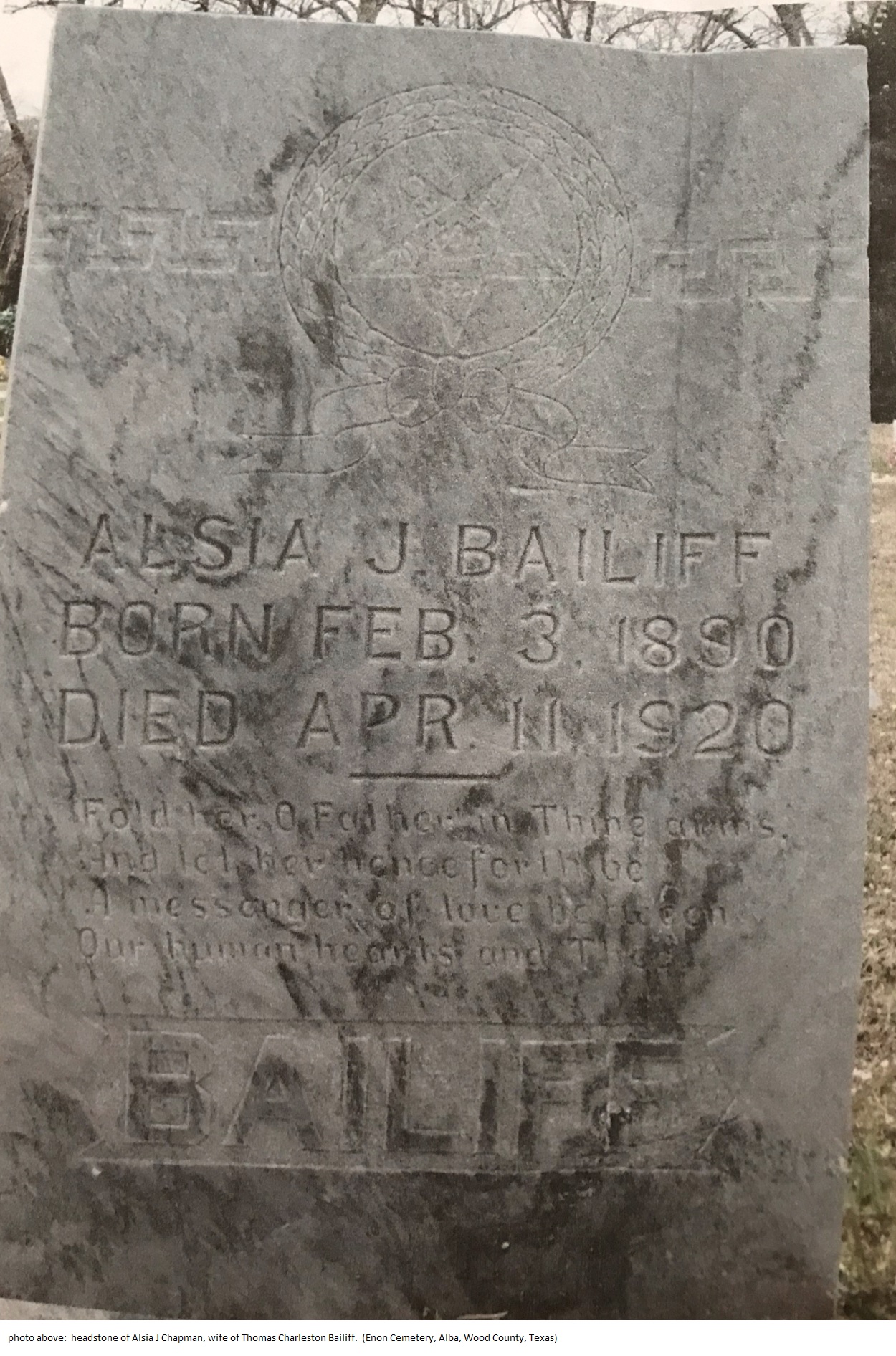 headstone of Alsia J Chapman, wife of Thomas Charleston Bailiff (Enon Cemetery, Alba, Wood County, Texas)