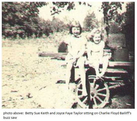 Betty Sue Keith and Joyce Faye Taylor sitting on Charlie Bailiff's buzz saw