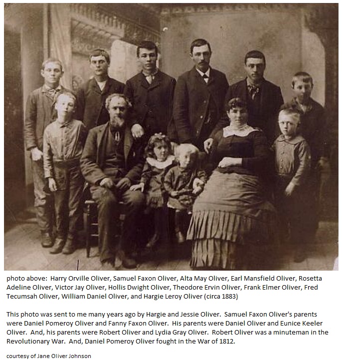 Harry Orville Oliver, Samuel Faxon Oliver, Alta May Oliver, Earl Mansfield Oliver, Rosetta Adeline Oliver, Victor Jay Oliver, Hollis Dwight Oliver, Theodore Ervin Oliver, Frank Elmer Oliver, Fred Tecumsah Oliver, William Daniel Oliver, and Hargie Leroy Oliver