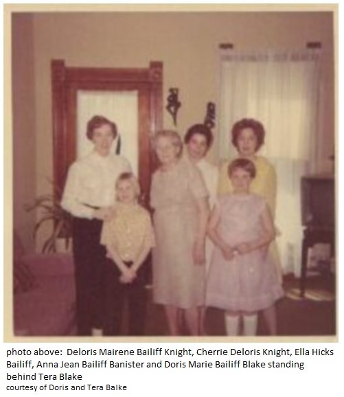 Deloris Mairene Bailiff Knight, Cherrie Deloris Knight, Ella Hicks Bailiff, Anna Jean Bailiff Banister and Doris Marie Blake standing behind Tera Blake