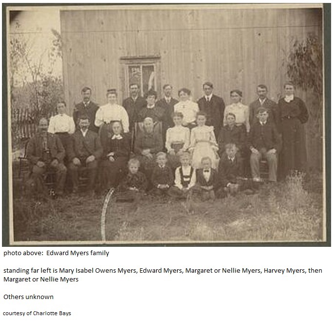 Edward Myers family. Standing far left is Mary Isabel Owens Myers, Edward Myers, Margaret or Nellie Myers, Harvey Myers, then Margaret or Nellie Myers. Others unknown.