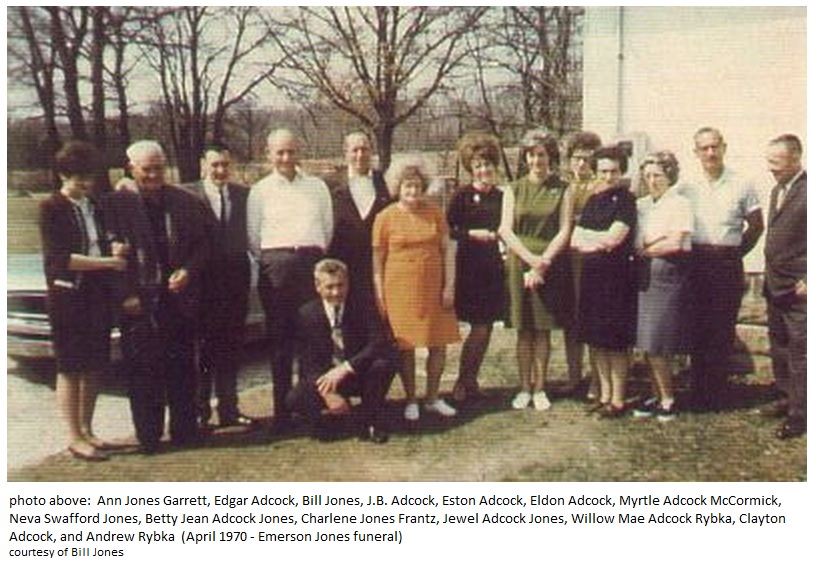 Ann Jones Garrett, Edgar Adcock, Bill Jones, J.B. Adcock, Eston Adcock, Eldon Adcock, Myrtle Adcock McCormick, Neva Swafford Jones, Betty Jean Adcock Jones, Charlene Jones Frantz, Jewel Adcock Jones, Willow Mae Adcock Rybka, Clayton Adcock, and Andrew Rybka