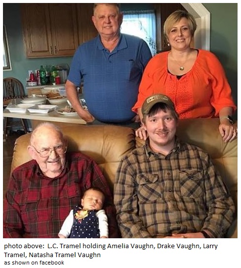 L.C. Tramel holding Amelia Vaughn, Drake Vaughn, Larry Tramel, and Natasha Tramel Vaughn