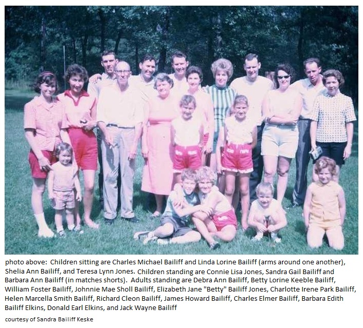 Charles Michael Bailiff, Linda Lorine Bailiff, Shelia Ann Bailiff, Teresa Lynn Jones, Connie Lisa Jones, Sandra Gail Bailiff, Barbara Ann Bailiff, Debra Ann Bailiff, Betty Lorine Keeble Bailiff, William Foster Bailiff, Johnnie Mae Sholl Bailiff, Elizabeth Jane "Betty" Bailiff Jones, Charlotte Irene Park Bailiff, Helen Marcella Smith Bailiff, Richard Cleon Bailiff, James Howard Bailiff, Charles Elmer Bailiff, Barbara Edith Bailiff Elkins, Donald Earl Elkins, and Jack Wayne Bailiff