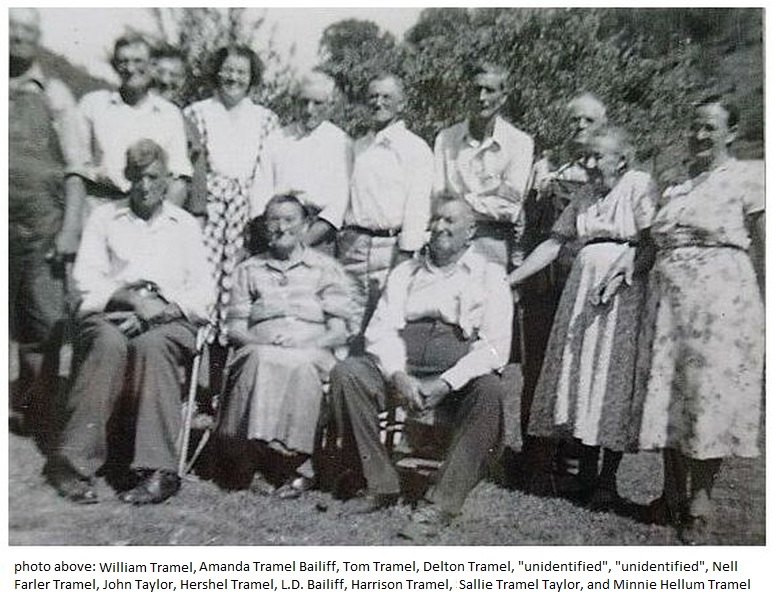 William Tramel, Amanda Tramel Bailiff, Tom Tramel, Delton Tramel, "unidentified", "unidentified", Nell Farler Tramel, John Taylor, Hershel Tramel, L.D. Bailiff, Harrison Tramel, Sallie Tramel Taylor, Minnie Hellum Tramel