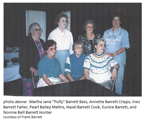 Martha Jane "Polly" Barrett Bass, Annette Barrett Cripps, Inez Barrett Farler, Pearl Bailey Mathis, Hazel Barrett Cook, Eunice Barrett, and Nonnie Bell Barrett Hunter